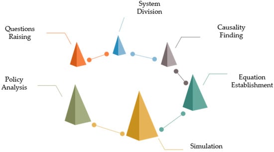 As shown in Figure 1 [41], when using the system dynamics model to analyze and solve a problem, one should first put forward clear and specific practical problems. Secondly, according to the subject and its behavior in relation to the problem, the system-boundary of the object of study can be determined. Thirdly, according to the interaction behavior and interaction mechanism among the subsystems, one can find the causal feedback relationship and draw the causal feedback loops. Fourthly, the causal feedback loops can be refined, and the overall operation model of the system can be built by the important state variables, speed variables, and auxiliary variables, which are selected to characterize the system boundary. At the same time, simulation Equations should be established. Fifthly, the values of specific coefficients in the simulation Equation are determined by historical data, and the fitting degree between the estimated value of the system model and the historical value should be tested. After determining the accuracy and scientific nature of the simulation model, one can predict and simulate the future development of the relevant indicators. Finally, by adjusting the correlation coefficients, one can analyze different policies and compare their various benefits, so as to provide a reference for stakeholders and decision makers.