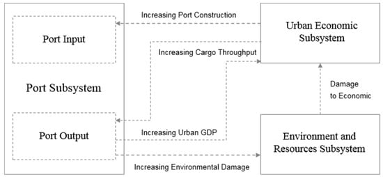 Based on the analysis of the three abovementioned problems, we divided the system into three subsystems: the port subsystem, urban economic subsystem, and environment and resources subsystem. Among them, the port subsystem can be further divided into the port input subsystem (that is, the port value creation activity) and the port output subsystem (that is, the port investment and construction activity). In the green coordinated development system of port and city, on the one hand, the port subsystem, urban economic subsystem, and environment and resources subsystem follow their own operation and development rules; on the other hand, they also need to accept feedback from each other. The structure of the system is shown in Figure 2. Among the elements of the system, the port subsystem, as an important economic growth pole, while driving the growth of urban GDP, will simultaneously increase the loss of urban resources and environmental pollution and have a negative effect on the environment resources subsystem. An increase in resource occupancy cost and environmental governance cost will increase the loss of urban GDP, which will hinder the development of the port to a certain extent.