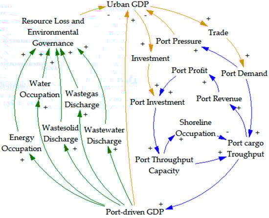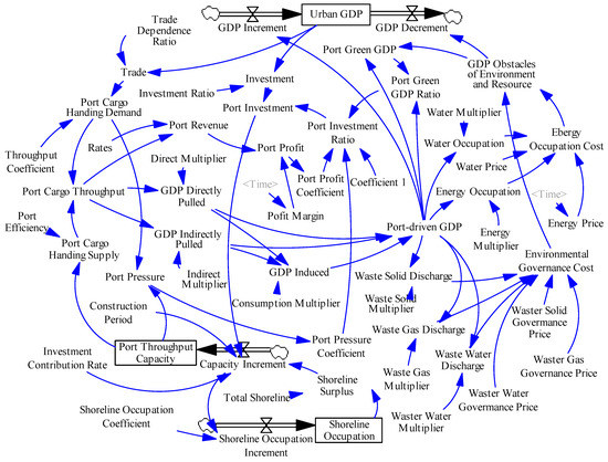 A detailed description of the causal feedback loops in the port–city green cooperative development system can clearly reflect the interactions among the subsystems. The main factors in the port subsystem are the port throughput capacity, port cargo throughput, port pressure (reflecting the extent to which port cargo handling demand exceeds port handling capacity), port-driven GDP, port revenue, port profit, port investment, and port demand. Port investment and port demand, as the interface of the urban economic subsystem to the port subsystem, are affected by the amount of investment in fixed assets and trade volumes in the city. On the one hand, port production directly provides power for the growth of urban GDP by generating economic benefits; on the other hand, it produces a negative accumulation effect on urban GDP through five relevant factors of the environment and resources subsystem; namely, waste solid discharge, waste water discharge, waste gas discharge, energy occupation, and water resources occupation. These factors interact with each other and form a causal feedback loop, as shown in Figure 3.
