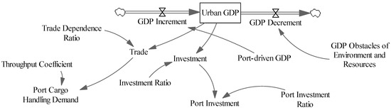 In the subsystem of the urban economy (see Figure 5), the state variable of urban GDP is obtained by integrating the difference between GDP growth and GDP reduction. Because the system only considers port-related production activities and their impacts, GDP increment depends on all the values of port activities, and GDP decrement equals the obstacles related to environment and resources caused by port production activities. The quantity of urban GDP can affect the volume of trade and investment in fixed assets, which may further influence the port cargo throughput and the port investment.