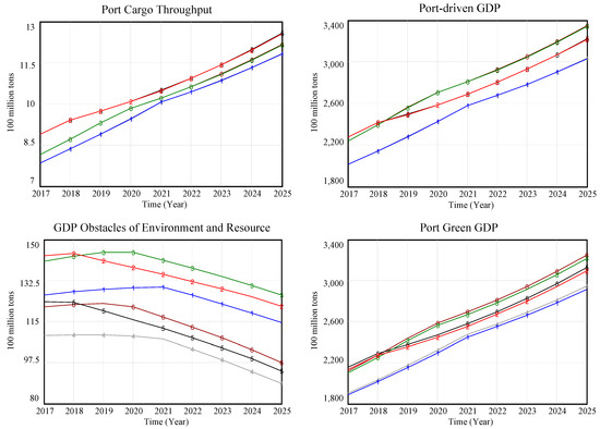 In the above simulation, we mainly focus on the changes of four “green port”-related indicators from 2017 to 2025, namely, port cargo throughput, port-driven GDP, GDP obstacles related to environment and resources, and green port GDP ratio. The simulation results are shown in Figure 9. In contrast to the results mentioned in Section 5.3, an increase in throughput coefficient or economic pulling multiplier can significantly promote the growth of urban GDP. However, it is noteworthy that an increase in cargo throughput in the port will be affected by port capacity and coastline resources. When the demand for port cargo throughput increases too quickly and is higher than the supply capacity of port cargo throughput, the actual cargo throughput will change from demand to supply. In Scheme 0, the port cargo throughput increases from 0.78 billion tons in 2017 to 1.01 billion tons in 2021, consistently equal to the throughput demand. However, in 2022, the demand for throughput increases to 1.07 billion tons, exceeding the supply of 1.04 billion tons, and the growth of actual cargo throughput is restrained. The same phenomenon occurs in Scheme 1, which leads to a situation in which the port-pulling GDP of Scheme 1 is higher in the early period but lower in the later period compared to that of Scheme 2. In addition, the growth of the port’s green GDP in Schemes 1 and 2 is not as good as that of the natural development mode, which indicates that further promoting port operations to promote GDP growth will cause greater damage to the environment and resources, and corresponding energy-saving and emission-reduction measures should be taken. Generally speaking, reducing the multiplier of environment and resources can effectively reduce the waste discharge and resource occupation of ports, and promote the green GDP rate of ports. In 2017, compared with the port economy pulling mode, the environment and resources’ GDP hindrance of various schemes under the energy-saving and emission-reducing mode decreases by 13.77%, and the port’s green GDP increases by 0.92%. In 2025, the increase and decrease ranges of the two indicators change to 22.79% and 1.04%, respectively, indicating that energy-saving and emission-reduction measures can better reduce the obstacles to GDP growth related to the environment and resources and enhance the port’s green GDP. In addition, the implementation of port energy saving and emission reduction can also promote the growth of the city′s overall GDP to a certain extent, and further achieve a positive accumulation effect through increases in port cargo throughput and port-driven GDP, and promote the port–city green coordinated development of Shanghai.