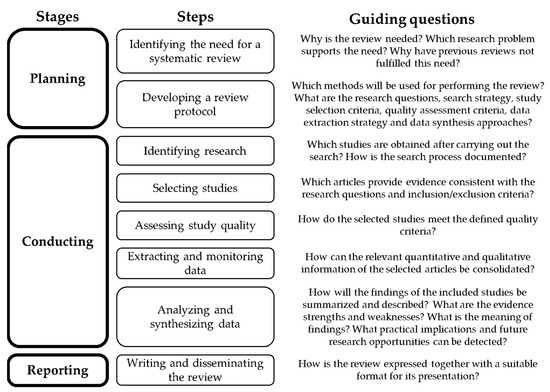 As shown in Figure 1, the methodology implemented to undertake this review involves three stages: planning, conducting, and reporting, which is in line with several suggestions [51,52,53]. The planning stage was accomplished through the identification of need, based on the research questions proposed, as well as through the definition of the search strategy, the selection criteria, the quality assessment criteria, the data extraction strategy, and the data synthesis approach. The conducting and reporting stages were accomplished from the contents of findings and discussion sections. In parallel, the Preferred Reporting Items for Systematic Reviews and Meta-Analyses (PRISMA) checklist [54] was also followed to ensure rigor of the review process.