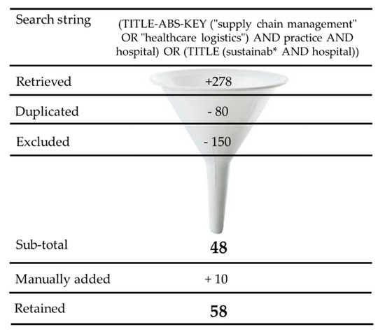 Inclusion, exclusion, and quality assessment criteria: Publications with direct applicability to hospitals, from a comprehensive perspective, were included. Those that moved away from these entities as focal organizations, or on the contrary, focused on very specific chains, such as blood or laboratory, were excluded. Studies were also filtered based on their relationship to the TBL approach. Thus, contributions that referred to sustainability as the continuity of the specific health programs implemented, in order to analyze the effectiveness of such programs, were excluded. Articles and reviews from peer-reviewed journals were primarily considered. However, by review of publications’ references, additional studies and international guidelines were considered suitable, such as References [58,59], since they specify SSCM practices applied in hospitals worldwide. Co-authors acted as coders to decide whether each publication retrieved from the search should be included or not. In cases of disagreement, these were discussed until consensus was achieved.