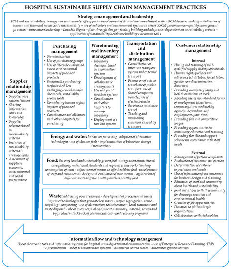 Strategic management and leadership practices are identified as a starting point to map out and control the resources, responsibilities, and implementation of other practices. Other categories, such as supplier management, purchasing management, warehousing and inventory management, transportation and distribution management, and information and technology management have traditionally been discussed from operational and economic perspectives. However, sustainability has contributed to the integration of environmental and social aspects into these topics, such as by considering the environmental and human rights impacts of procured products. Likewise, energy, water, food, hospital design, waste, and staff and community behavior have had a primarily environmental focus, as addressed by Reference [50].