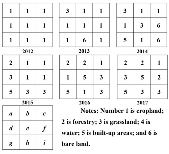 In the land-use trajectory calculation, cropland unchanged throughout the research period, e.g., pixel c (Figure 4), is classified as stable cropland. Lost cropland is identified according to the occurrence of built-up land. For example, croplands in pixel e and g were converted to built-up land in 2016 and 2014, respectively. These pixels are all classified as lost cropland. Fallowed cropland and abandoned cropland are classified according to the successive time cultivation has ceased. For example, land-use trajectories in pixel d and h indicate that cultivation ceased in 2014 and 2012, respectively. However, in the following years, they are recultivated. According to the definition, they are classified as fallowed land. In pixels a, b, f, and i, cultivation ceased for five, two, four, and four years, respectively. These pixels are classified as abandoned cropland. In addition, pixels f and i do not appear as forests, while pixel a and b emerged forested during the research period (six years). Therefore, croplands in pixel f and i are identified as spontaneous abandonment, while cropland in pixels a and b are classified as induced abandonment, i.e., resulting from the Grain-for-Green policy. This method was utilized to map cropland abandonment in Zhongduo from 2012 to 2017.