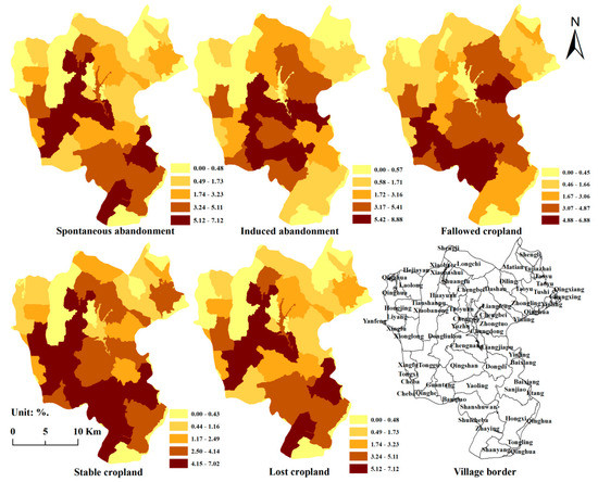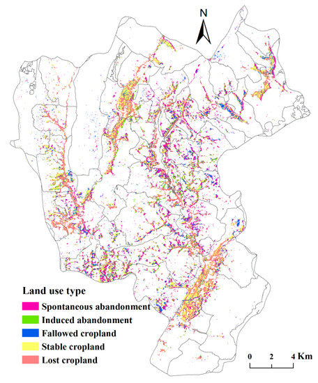Spontaneous abandoned cropland was mainly distributed in Sanjiao and Zhaying Villages, southeast Zhongduo Town (Figure 7), and in Huayuan, Dongliukou, Chengnan, and Tonggu Villages along the Baomao highway; these six villages contributed 38.83% of the total area of spontaneous abandoned cropland. Induced abandoned cropland was mainly distributed in the villages of Liangjiapu, Chengnan, Guantang, and Yaoling, forming a ring around Qingshan Village in central Zhongduo; these four villages accounted for 28.41% of the total area of induced abandoned cropland. Fallowed cropland was mainly distributed in Tonggu, Guangtang, Yaoling, and Shanshuwan Villages in the southwest, and Zhongtuo village in the central-east; these villages accounted for 30.14% of total fallowed cropland. Stable cropland was mainly distributed in villages along the western border and in areas of two valleys, and lost cropland was mainly distributed in the two valleys of Zhongduo Town.