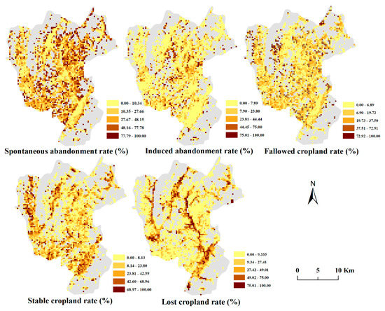 To better discern the spatial features of cropland abandonment, a random raster with a resolution of 300 m was created, and the cropland abandonment rate in each pixel was calculated (Figure 8). As shown, serious spontaneous abandonment, with a rate of 77.79%, was most prevalent in northeast central Zhongduo, central areas of Dongdi Village in southeast Zhongduo, and in the junction areas of Tonggu Village, Dongliukou Village, Qingshan Farm, and Guantang Village in southwest Zhongduo. In comparison, serious induced abandonment, with a rate of 75.01%, mainly emerged in central Zhongduo. Serious land fallow, with a rate of 72.92%, was primarily distributed in central-west Zhongduo. Compared to the scattered distribution of serious spontaneous abandonment across the whole town, areas showing serious induced abandonment and fallowed land were relatively concentrated.