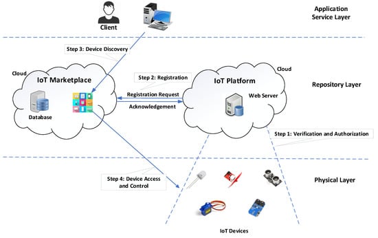 The repository layer includes the configuration, installation of a web server and deployment of IoT platform and IoT Marketplace. The repository layer is used for IoT devices’ metadata storage. MQTT protocol is used for communication between the physical layer and repository layer. RESTful APIs are used for the registration of IoT devices.