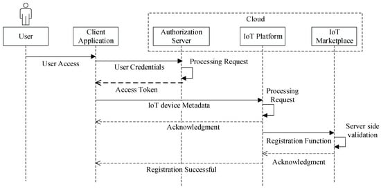 Figure 2 represents the sequence diagram for the registration of an IoT device on the marketplace. The user accesses the client application and enters the credentials i.e., username and password for authorization. Authorization is required so that the user can retrieve data from the server. After the user is authorized, the server generates access token in response. The user enters IoT device metadata like device name, device type, IP address, MAC address. IoT device meta-data along with access token is sent to the webserver via a POST request for verification. The web server processes the request. If the IoT device is verified it sends back the acknowledgment to the client application. After authorization of user and verification of IoT device, it sends POST request to the IoT Marketplace for registration via RESTful API. At this stage, the visibility mode of the IoT devices can be set public or private. IoT Marketplace processes the request and stores the information in the database. It sends an acknowledgment back to the webserver. Notification is sent back to the client application for successful registration.