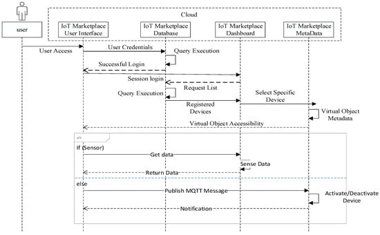 Figure 3 represents the sequence diagram for the discovery and accessibility of an IoT device. There are two types of visibility mode for IoT devices. Either the IoT device is made public for everyone to use or private to be used only by the owner. In the first step, the user gets access to the IoT marketplace. The user enters its credentials i.e., user name and password to log in. If credentials are invalid it means that the user has entered the wrong username or password. The user is notified with invalid credentials notification. If the user has successfully logged in, a session is created for that user. The user gets a list of the registered IoT devices. IoT devices can be monitored and controlled after discovery. If the user selects a sensor, then it retrieves the values of the corresponding sensor e.g., if the user selects BME280 sensor, it will send temperature, humidity, and pressure values to the IoT marketplace. If the user selects actuator, it will require some action to be performed e.g., turn On or turn Off the actuator. It will publish the command via MQTT protocol to the corresponding IoT device. The IoT device will be subscribed to that message against a unique topic. It will perform the required action and notify the user.