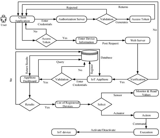 Step 1 includes authorization and verification of the users and IoT devices respectively. Web services could be easily accessed by any user if the URL and input parameter are disclosed to get an output. To keep unauthorized people away from accessing the APIs, the proposed system uses the OAuth 1.0 authentication method for the authenticity of the users at a checkpoint. OAuth 1.0 authenticates the client in three steps. First, the user enters its credentials i.e., username and password, and sends a POST request to acquire a request token. In the next phase, the user will pass the token and token secret as a query parameter to the authorization URL provided by the IoT platform. If the user authorizes, it will generate an access token. The user is granted access to retrieve data from the server with the access token. After the authorization, the user can enter device information like device name, device type, device IP, device MAC address and send a POST request to the web server for verification. The web server validates by checking weather the device information is valid or not.