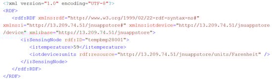 Figure 5 presents the RDF/XML format of BMP280 temperature sensor data. This example shows data being retrieved in RDF/XML format. Data gathered from the surrounding environment is transformed into RDF/XML format. This device has the ID as ‘tempbmp28001’. The unit set to retrieve the sensor value is in Fahrenheit and the value of the temperature sensor is 59 Fahrenheit. The data is then decoded and displayed on the IoT marketplace.