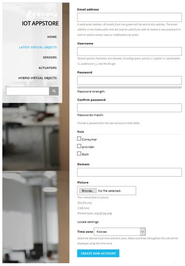 Figure 8 shows the user registration form on IoT Marketplace. User registration is necessary to provide secure and reliable services. It will keep a record of registered users and avoid unauthorized users. To create a new account on the IoT marketplace, it requires a valid email address, available user name, strong password, Role of the user, domain, and picture (optional), and time zone. There are two types of Role i.e., consumer and provider. The consumer is any user that wants to monitor public and private registered IoT devices e.g., the user wants to see the temperature of some specific location. The provider is any user that provides services to the users and can monitor and control IoT devices e.g., the user wants to monitor and control the camera. The domain can be e.g., home, or office. In local settings, the user can set the time zone of the current location. The time zone will help to discover the nearest sensors or actuators. In