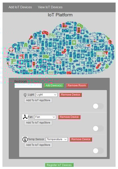Figure 9 shows the web interface of the IoT platform in which a registered user can add IoT devices to which they can monitor and control. From this figure, we can depict that the user is adding IoT devices for a smart home environment. Users can add multiple rooms in a smart home. The user can create a bedroom and add multiple IoT devices. The user can add a light, fan, temperature sensor to which it can be monitored and controlled.