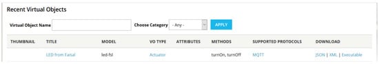Figure 10 shows the discovery of the IoT device. Users have access to public and private registered IoT devices. In this figure, the user can search for any IoT device in the search bar and choose the category type. It will return the list of registered IoT devices. Users can select any IoT device i.e., sensor or actuator. In this case, the user has searched for an LED. Users can perform some specific actions like turn On the LED or turn Off the LED. Users can download JSON or XML format of the IoT device to send commands to the corresponding IoT device.