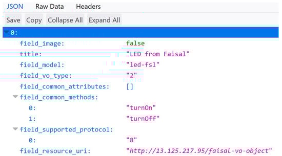 Figure 11 represents the JSON format of the virtual object of IoT device on the Marketplace. user can download the virtual object in two formats i.e., JSON or XML. Virtual object meta data includes virtual object title, model, type, attributes, and supported protocols.