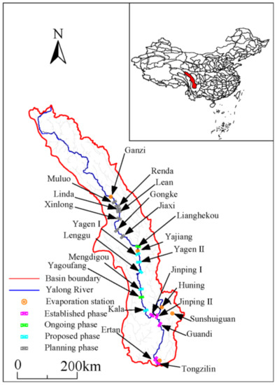 The basin is rich in hydropower resources, which is one of the thirteen state hydropower bases in China. According to the comprehensive planning of the river basin, the Yalong mainstream planning is divided into four stages, namely the established phase I (5 hydropower stations, which are Jinping I, Jinping II, Guandi, Ertan, and Tongzilin), the ongoing phase II (2 power stations, which are Lianghekou and Yangfanggou), the proposed phase III (5 power stations, which are Yagen I, Yagen II, Lenggu, Mengdigou, and Kara) and the planning phase IV (7 power stations, which are Muluo, Renda, Linda, Lean, Xinlong, Gongke, and Jiaxi), which can develop 19 large and medium-sized cascade hydropower stations with good reservoir regulation performance and an installed capacity of about 30 million kW (Table 1). The key parameters and locations of the 19 cascade hydropower stations and the locations of 5 evaporation stations are shown in Table 1 and Figure 1.