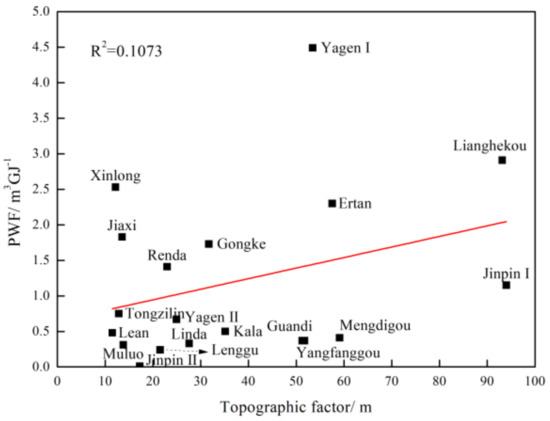 From Figure 4, the PWF of the 19 hydropower stations in the basin had a very poor correlation with topographic factor (R2 = 0.1073), indicating that the PWF in Yalong River Basin was less affected by the topographic factor.
