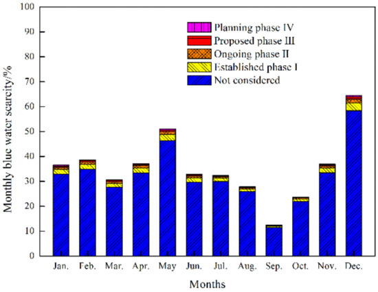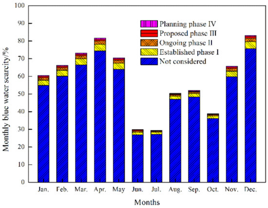 Thus, the BWS belongs to low blue water scarcity (<100%) with or without considering the EWFs of the four phases of the hydropower station hydropower stations in the Yalong River Basin, which means that the development and utilization of cascade hydropower stations in the basin did not affect the local environmental flow requirements from the perspective of water footprint. However, the river basins with poor water resources suffered from a moderate to severe water scarcity when the EWF was considered, such as Haihe and Huaihe River Basin in China [18]. Therefore, when assessing the blue WS in basins or regions, it is necessary to consider EWF.