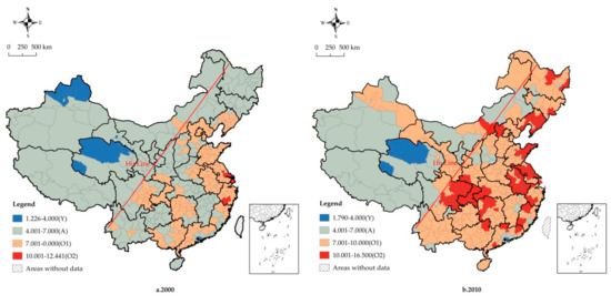 According to the United Nations, the age structure of a country or region is young when its aging population ratio is less than 4%; when the aging rate exceeds 7%, the country or region enters the aging stage [67]. To more intuitively reflect the spatial distribution and evolution model of China’s population aging, this paper also draws on the division of population aging measurement criteria proposed by Xu et al. and divides the population age structure into six types. If the aging population ratio is below 4%, the area corresponds to young (Y); between 4% and 7%, the area is adult (A); between 7% and 10%, the area is early-aged (O1); and above 10%, the area is late-aged (O2) [38]. Referring to this standard, a spatial distribution map of China’s population aging from 2000 (Figure 3a) to 2010 (Figure 3b) is drawn.