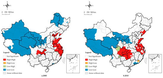 The above spatial distribution pattern of population aging also indicates obvious spatial agglomeration characteristics of China’s population aging. Therefore, it is necessary to verify and measure this spatial agglomeration, demonstrating the distribution characteristics of different types of spatial clustering and outliers. Table 1 reveals the statistics of the global Moran’s I. The global Moran’s I was significantly positive at the 1% confidence level in 2000 and 2010, indicating a strong, positive spatial correlation and a spatial distribution pattern of similar value aggregation of population aging in various prefecture-level units in China, rather than being regarded as an independent observation. Compared with 2000, the overall Moran’s I in 2010 decreased from 0.639 to 0.623, which indicated that the spatial agglomeration of China’s aging population weakened at the prefecture level.