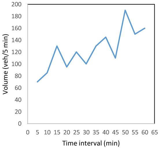 Video data analysis was performed using CarCam to collect real traffic data on a two-lane road section near Budapest. The road was approximately 5 km long (M1 motorway, Hungary) in one direction of travel. Video data collection was performed for 4 hours from 7 a.m. to 9 a.m. and 3 p.m. to 5 p.m. on a typical weekday under clear weather conditions. The collected video data were then extracted with the help of semiautomated data extraction software to get the mean speed of cars and traffic volume at each 5 min interval. First, the results of video data analysis were utilized to measure the mean speed by measuring the time taken by a vehicle to cross the longitudinal section of 30 m using a software program. The plot results showed that most of the vehicles were travelling at varying speeds with dispersion between 100 and 140 km/h, as shown in Figure 1. Second, the results of video data analysis were utilized to measure the traffic volume on a specified road section for the stated period. The plot results showed that traffic volume varied significantly in different time intervals. However, it helped to obtain information about the minimum (960 veh/hr) and maximum (2280 veh/hr) traffic counts for simulation analysis purposes, as shown in Figure 2.