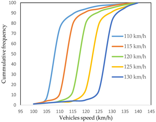 We first considered simulating the effect of average desired speed variation on lane change frequency. Previous studies have noticed that changes in speed affects serious crashes substantially more than less serious crashes, with most data related to rural roads and motorways [13,61]. In the past 20 years, nearly all countries have either increased or decreased their speed limits on the motorway network. In addition, the speed limits in Hungary outside built-up areas were increased from 120 to 130 km/h on motorways and from 100 to 110 km/h on motor roads (semimotorways) in 2001 [24]. Based on observed video speed data, the average speed in this study varied from 110 to 130 km/h with a wider range (110, 115, 120, 125, and 130 km/h) to measure their effect on lane changing for road safety. In London, the noncompliance level (the level of noncompliance with the speed limit) ranges from 4% to 73%, while the noncompliance level ranges from 2% to 82% outside London [17]. The speed range for each simulated average speed was given as an input in the model, as shown in Figure 3.