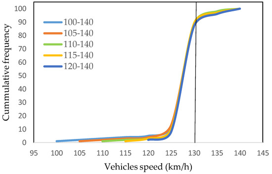 We further simulated the effect of desired speed distribution on lane change frequency for a freeway by maintaining the average speed at 130 km/h. The distribution function of desired speeds is a particularly important parameter as it has an impact on lane change frequency. VISSIM provides the opportunity to distribute the percentage of speed values over smaller to larger limits. In VISSIM, the desired speed is a significant parameter that has a great influence on travelling speeds, which is explained as a distribution rather than a fixed value [62]. The speed distribution represents the proportion of vehicles driving at or below certain speeds. It is also likely to use the speed distribution to specify how the speed of all vehicles varies [27]. A previous study stated that high-risk drivers exceed the speed limit by at least 25 km/h, so the “desired speed distribution” of the vehicles that represent speeding drivers was set as 120–150 km/h [63]. We considered real speed data (Figure 1) to analyze the effect of different speed distributions on lane changing for road safety. The largest speed distribution was set between 100 and 140 km/h with higher speed variations of traffic flow, and some other speed distributions were also set to comprehensively analyze the effect of speed distribution on lane changing. Accordingly, the smallest speed distribution was set between 120 and 140 km/h with lower speed variations of traffic flow. The maximum and minimum values of the speeds and the dispersion between these values were defined for an average speed of 130 km/h (freeway) in the model, as shown in Figure 4.