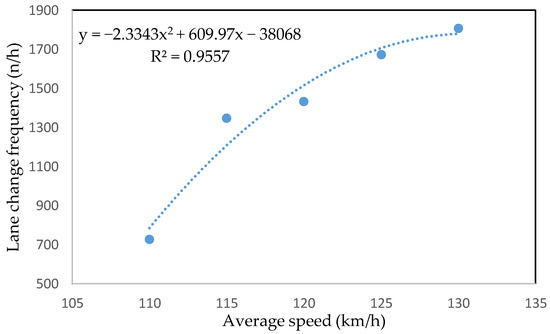 Lane change frequency was measured for each simulation, with the average desired speed varying from 110 to 130 km/h with an interval of 5 km/h. Each observed average speed was simulated under a specified speed range (Figure 3). The relationship between average desired speed (km/h) and lane change frequency (n/h) is plotted in Figure 5. It can be seen that there was a positive relationship between the two variables, with lane change frequency increasing with the increase in average desired speed of cars. The results can be explained by the fact that high-speed conditions can cause frequent overtaking maneuvers [66]. A previous study showed that, after the implementation of higher speed limit, the number of injury crashes, as compared to the control, rose significantly on 130 km/h roads but not on 110 km/h roads [62].