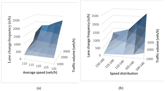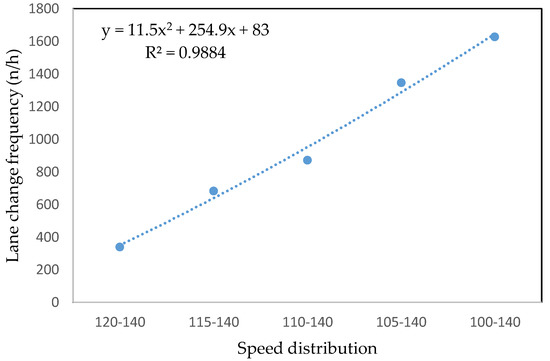 The effect of speed distribution on lane change frequency was analyzed, and the results are plotted in Figure 6. All speed distribution data were set by maintaining an average speed at 130 km/h (freeway) (Figure 4). A previous study on displacement of speed distribution showed larger displacements for higher speeds [67]. The plot results showed higher lane change frequency for large speed dispersion and lower lane change frequency for small speed dispersion between predefined limits. In other words, when speed distribution was high, the examined vehicles tended to change lanes frequently due to the difference in speeds between vehicles. Some previous studies have found speed variations to be positively related to crashes [44,45,47,68].