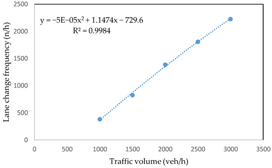 We observed the relationship between traffic volume and lane change frequency, as shown in Figure 7. Lane change frequency was measured for each simulation, with the traffic volume varying from 1000 to 3000 vehicles per hour with an interval of 500 vehicles per hour. Speed distribution was set in such a way that all simulated vehicles were moving on the road section within the speed limit (130 km/h). The plot results showed a positive relationship between the two variables, with lane change frequency increasing with the increase in traffic volume. When the number of vehicles increased in a specified period, more vehicles tended to change lanes for overtaking purposes. A previous study [11] had also found a positive correlation between risk factor and traffic flow efficiency in lower traffic demand.