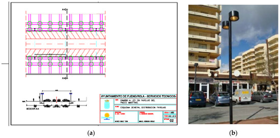 Luminaire detail and their position on a plane. (a) Detail plan of luminaire arrangement in the street; (b) Luminaire detail. (Source: own elaboration).