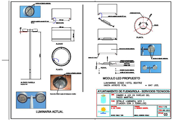 This model of the Technical Specification is intended to tender the supply, replacement and installation of 1034 energy-efficient and environmentally sustainable LED luminaires, replacing 1034 existing luminaires currently equipped with lamps (HM) and electromagnetic ballast with others equipped with LEDs, including dimmable plate and source (dimmable 1–10 V and potentiometer 100 K), and which are capable of point-to-point intercommunication by radiofrequency (Figure 1).