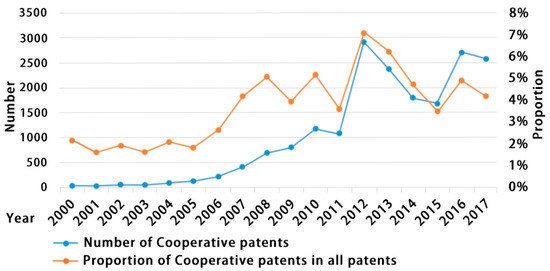 Patent cooperation and ratios in Hangzhou city, China from 2000 to 2017.