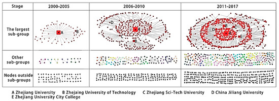 Based on the cooperative relationship of collaborative innovation subjects, the corresponding relationship matrix was established. UCINET6 (UCI, Irvine, CA, USA, 2008) was used to calculate the network center potential, network density, and average distance, which can be used to depict the overall topology structure and help with understanding the overall development process and trend of the Hangzhou collaborative innovation network (Table 3). The calculation results showed that the network center index and network density declined during the whole period from 2000 to 2017, and the average distance continued to increase. This indicates that the collaborative innovation network had a loosening trend, and the connection strength between innovation subjects was declining.
