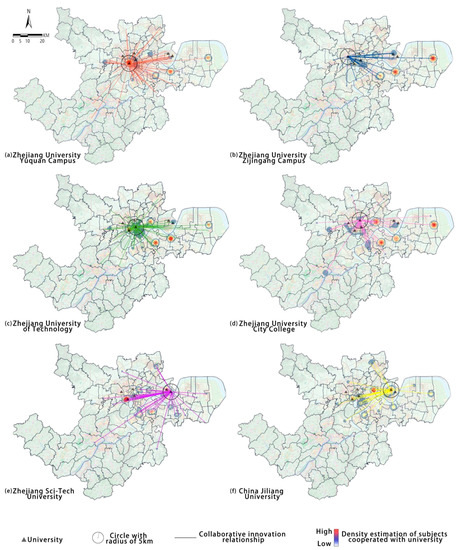 Universities are the important center and cores of the collaboration innovation network, and the relationships in which they are involved cover the main built-up area of the city (Figure 5). The area within a radius of five kilometers from the center of a university contains a high concentration of innovation subjects that have synergistic relationships with the university, such as Zhejiang University Yuquan Campus, Zhejiang University of Technology, Zhejiang Sci-Tech University, and China Jilang University. The innovation subjects with collaborative relationships with universities were characterized by spatial agglomeration development in urban central areas and industrial parks, and a scattered distribution in other areas. The universities had different spatial synergistic relationship orientations (Table 6).