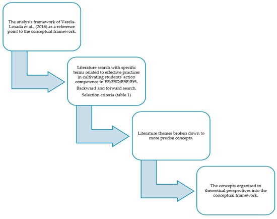 Literature themes were then broken down into more precise concepts as articles were reviewed according to their core findings. These concepts were deductively organised into theoretical perspectives determining the analytical framework—the crux of this article. We have also looked for references cited in this initial sample of sources (backward search), and for studies that cite our initial sample of studies (forward search). The process continued until we reached a ‘saturation point’. The final conceptual framework received feedback from an expert in the field of ESD and it was revised accordingly. Figure 2 shows the procedure that was followed.