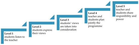 Shier [] categorised the participation of students in five levels (Figure 4). Level 1: students listen to the teacher. Students are allowed to express their views but it is upon them and they are not encouraged to do so. Level 2: students express their views. The teacher encourages student to express their views. Therefore, the teacher should have effective communication skills and apply creative technique to make students express themselves (e.g., via visual methods, art activities, surveys and interviews). Students’ views, however, are not taken into account but only heard. Level 3: students’ views are taken into consideration in decision-making. This does not mean that every decision is taken according to students’ wishes. However, students’ views are one of the many factors that are taken into account and the teacher explains why the students’ wishes were not possible to be accomplished. Level 4: students get involved in decision-taking. This level can be seen as a transition from consultation to active participation in the decision-making process. Until now, students have been encouraged to express their views but they do not have an active role at all stages of decision-making. The decision is made by the teacher. At level 4, the teacher and the students plan the activities of the scheme programme jointly. Level 5: they share with the teacher responsibility and power in when taking decisions. While at level 4, students are actively engaged, they do not have any real power. At level 5, though, the teacher is willing to give some of his power over to students. For instance, students take part in a committee as equals to the teachers. It is important that students share responsibilities that are developmentally appropriate for them. The teacher should then create a supportive environment. It is evident that the goals of ESD will be accomplished when ESD teaching will be directed to the high levels of students’ participation []. However, it seems that it is a challenge for schools [] to incorporate high levels of students’ participation in ESD teaching.