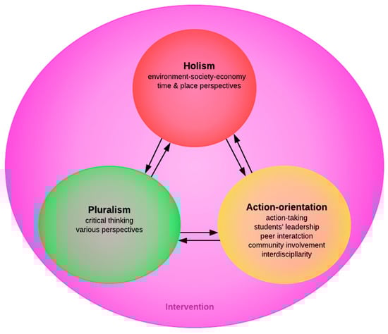Action-taking, students’ leadership, peer interaction, community and interdisciplinarity seem to be prerequisites for developing students’ action competence regarding problems related to SD issues. It seems that an action-oriented approach in ESD is a crucial dimension for the development of a powerful learning environment in ESD. However, it appears to be necessary to integrate all three aspects of a powerful learning environment in ESD into one conceptual framework—the Holism-Pluralism-Action-orientation in the ESD framework (Figure 5). This is because each of them adds something different to our understanding to effective ESD teaching. The holistic approaches refer to the content of ESD teaching, whereas the pluralistic and action-oriented approaches refer to the pedagogical methods applied in ESD. If one of these dimensions is lacking, ESD teaching will fail at stimulating students’ action competence in relation to SD issues.