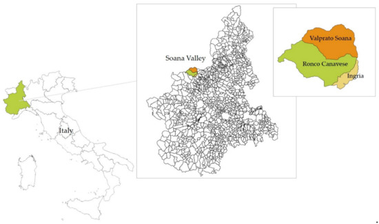 The study was carried out in Soana Valley, an alpine inner area in the northwestern Italian Alps, Piedmont Region, located about 60 km from the main town of Torino. Soana Valley has three municipalities—Ingria, Ronco Canavese and Valprato Soana—with an overall surface of about 182,870 km2 and a population of 455 inhabitants, with a density of 2.49 in/km2 (Figure 1).