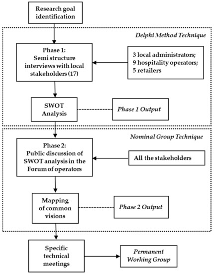 Moreover, the Delphi method was used alone [90,98,99,103,104,105,106] or with other quantitative and/or qualitative investigative instruments, for example, Data Envelopment Analysis (DEA) [91,94,95,107], Analytic Hierarchy Process (AHP) [94,107,108,109,110,111,112,113,114], cluster analysis [92,115,116] or Nominal Group Technique (NGT) [117,118,119,120,121]. NGT aims at building consensus among different stakeholders belonging to a group [114] and it is useful when difficulties in identifying problems and their solution within a community or group occur [122]. It allows to overcome group decision-making related issues [123] and stimulates the participation of all interested subjects, including the inhibited ones [122]. This technique involves several steps to reach the consensus—to bring out ideas to be shared later, the first phase is dedicated to individual reflection on topics identified by a facilitator; the second phase involves sharing ideas and the identification of priorities for the collective good [122]. Therefore, NGT allows individual and group working at two subsequent stages, which conclude with a list of priorities [124,125]. Even if there are some examples of implementation of the NGT tool in the tourism sector [126,127,128], to the authors’ knowledge a lack in its application when considering the inner mountain area still exists.