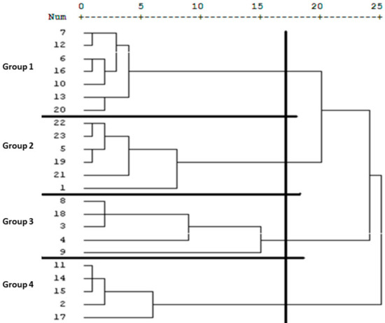 | C1 (n = 7) | C2 (n = 6) | C3 (n = 5) | C4 (n = 5) | Total (n = 23) | F | ||||||