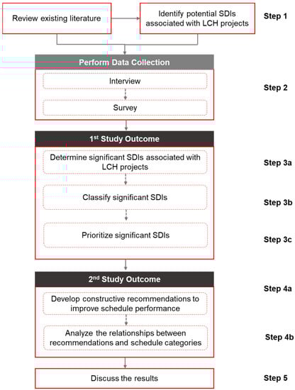 Figure 1, the collected survey data was analyzed to determine and classify the significant SDIs associated with LCH projects. The significant SDIs were ranked and prioritized, using the RII approach. In the fourth step, constructive and practical recommendations, based on the outcomes of the previous steps, were developed and proposed. The relationships between the recommendations and schedule categories were investigated, and the results were discussed in detail.