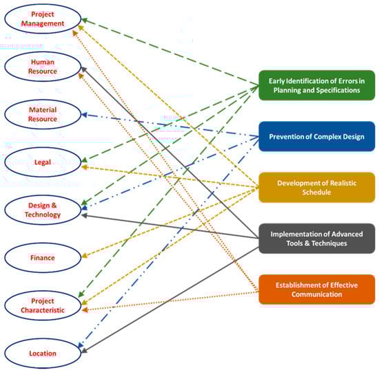 Figure 4, the elimination of complex designs in LCH projects could potentially prevent delays in LCH projects by precluding the issuance of major design changes and modifications belonging to the design and technology category. The execution of a complex design for an LCH project might require skilled, experienced, and qualified team management members and laborers, as well as advanced technologies and equipment, resulting in many design changes and modifications and schedule delays. Therefore, it can be concluded that the elimination of complex designs in LCH projects would help mitigate schedule delays.