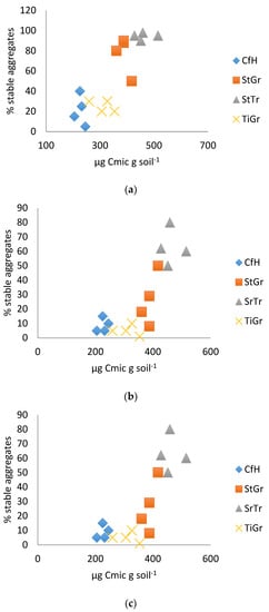 (a). Soil surface test correlated with microbial biomass 2014. (b). Soil surface test correlated with microbial biomass 2015. (c). Hose test correlated with microbial biomass 2014. CfH = conventional fertilizers and herbicide with a grass alleyway, StGr = straw mulch in the tree row with a grass alleyway, StTr = straw mulch in the tree row with a legume (birdsfoot trefoil, Lotus corniculatus) alleyway, TiGr = tillage in the tree rows with a grass alleyway.