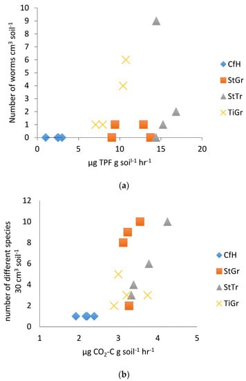 (a). Earthworm abundance test correlated with dehydrogenase enzyme assay as measured by reduction of triphenylformazan (TPF) per gram of soil per hour in 2014. (b). Biodiversity test correlated with laboratory measured soil basal respiration in 2014. CfH = conventional fertilizers and herbicide with a grass alleyway, StGr = straw mulch in the tree row with a grass alleyway, StTr = straw mulch in the tree row with a legume (birdsfoot trefoil, Lotus corniculatus) alleyway, TiGr = tillage in the tree rows with a grass alleyway.