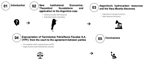 This paper is structured in 5 sections (Figure 1). Section 2 reviews the fundamentals of the new institutional economics and analyzes the institutional framework of the Argentine State to understand its policy-making. Section 3 focuses on the study of Argentina’s energy resources and an assessment of the importance of the discovery of the Vaca Muerta reserves. Section 4 analyzes the legality of YPF’s expropriation and how it is resolved by agreement between the parties and not by judicial means. In addition, it analyzes how this expropriation and its circumstances deteriorated the investment climate in the country. Section 5 presents the conclusions of the paper.