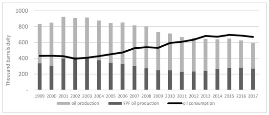 Oil consumption and production in Argentina. Sources: Author elaboration based on [28] and Ministry of Energy and Mining of Argentina.