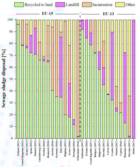 Nowadays, in EU-28, land application is the main route for sewage sludge recovery: 50% of sewage sludge is spread on agriculture soils, 28% is incinerated, and 18% are still disposed in landfills [2]. The remaining fraction is disposed through other methods such as pyrolysis, storage (e.g., Greece, Italy, and Poland), reuse in green areas and forestry (e.g., Ireland, Latvia, and Slovakia), and landfill cover (e.g., Sweden) [1]. Figure 1 shows the sewage sludge recovery route for every Member State. The political choices on the alternative routes of sludge recovery/disposal, in particular for the land spreading, are strongly influenced by the population density and the availability of agricultural lands. The low availability of soils for the spreading of biosolids led the northern European countries (such as Netherlands and Germany) to choose incineration as the principle recovery route. Furthermore, even though all of the sludge produced could be applied in less than 5% of the agricultural area (in most Member States), the limited use of biosolids in agriculture is due to the low level of acceptance by farmers and the public [49]. This aspect influences policy decisions on sludge management, too; therefore, every Member State has issued a national regulation.