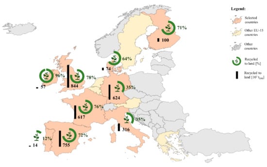 The selected countries, the percentage of biosolids recycled to land, and the total annual amount of biosolids spread on soil [2].